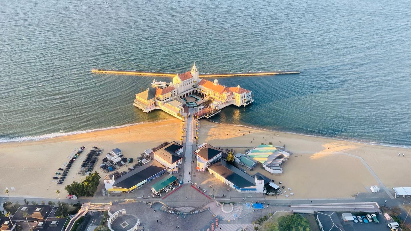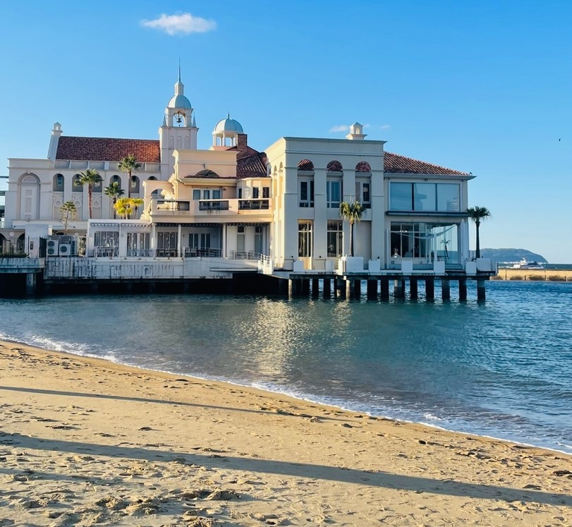 다음 사진은 모모치 해변의 추천 포토 스팟입니다. 눈에 띄는 이국적인 건물은 웨딩홀로 일반인은 출입금지라고 합니다. 건물을 배경으로 인생샷을 찍어보는 것은 어떠신가요?