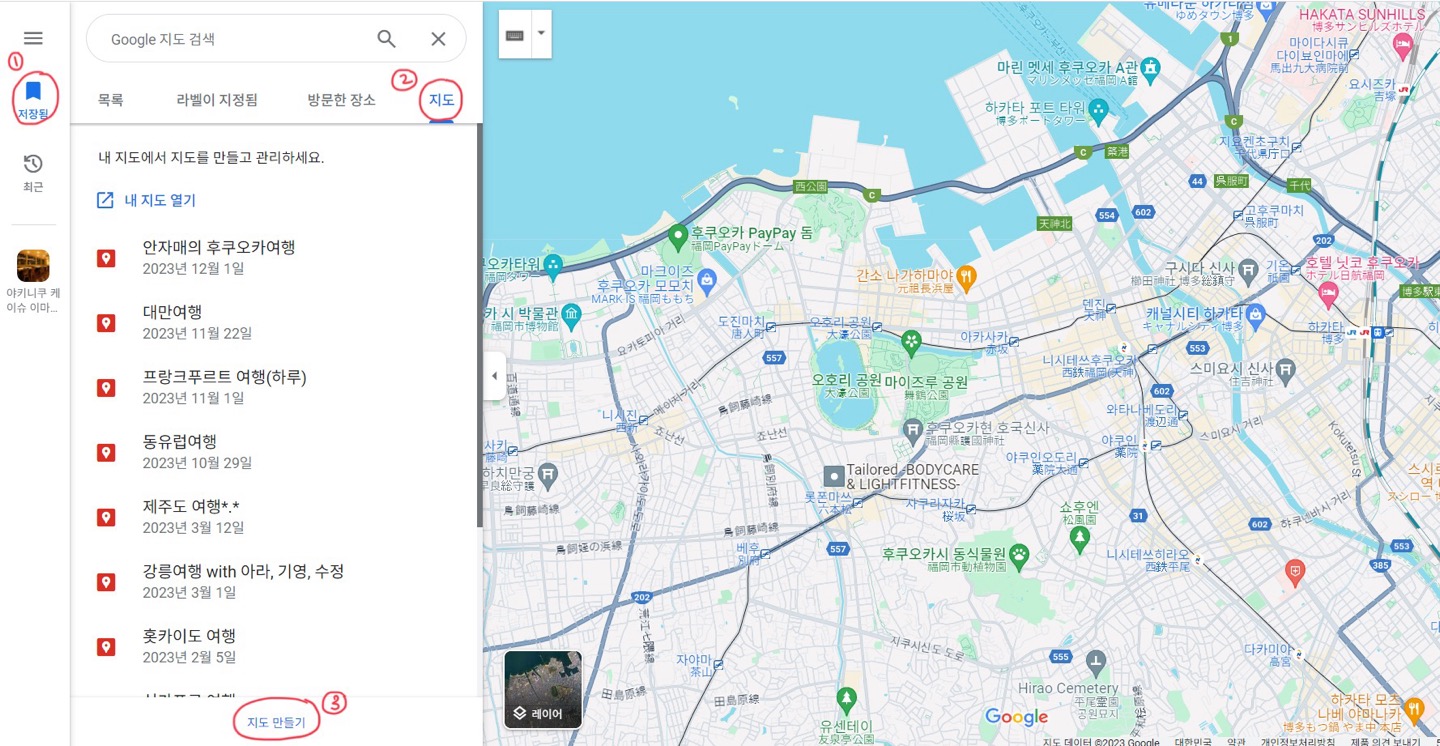 안언니는 여행을 계획하면 항상 구글맵에서 여행별로 지도를 만듭니다. 해외여행을 가면 구글맵을 많이 활용하는데, 여행별로 가고자 하는 곳을 표기하고 레이어별로 정리해 준다면 여행을 다닐 때 활용하기 좋습니다. 가고자 하는 곳을 숙소, 맛집, 관광 등으로 나누어 저장도 가능하고 여행 경로를 미리 설정할 수 있어 여행 계획을 세우며 만들기에 좋습니다. 안자매의 경우에 여행 경로는 미리 설정하지 않고 가고자 하는 곳을 저장하여 레이어별로 정리만 하였습니다. 여행을 다닐 때는 저장한 장소를 누르고 경로를 눌러 예상 소요시간을 확인하고 경로를 참고하여 다녔습니다. 구글 지도는 어떻게 만드는지 과정을 설명해 드리겠습니다.