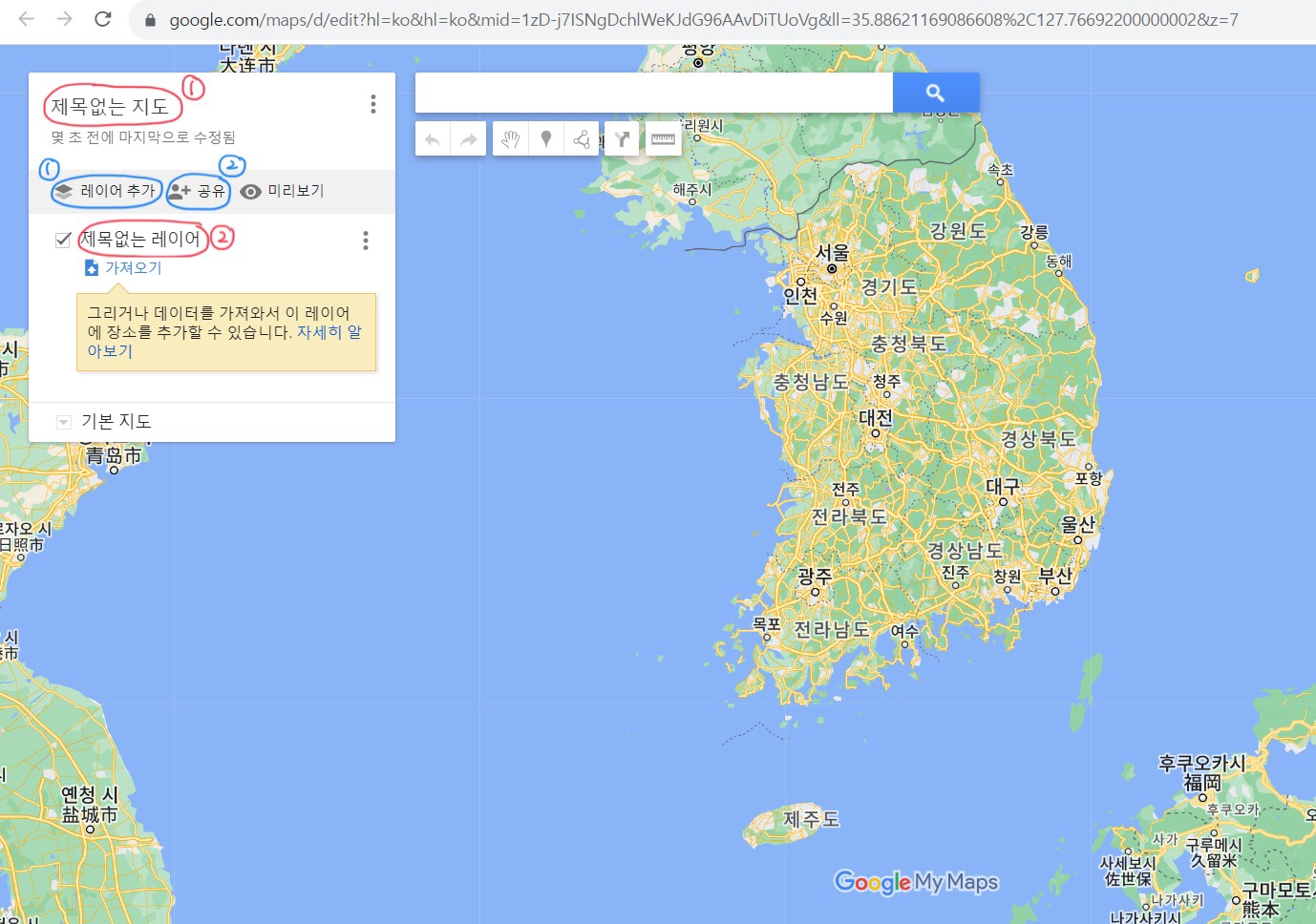 - 빨강①: 클릭하여 지도의 이름과 내용을 추가할 수 있습니다.