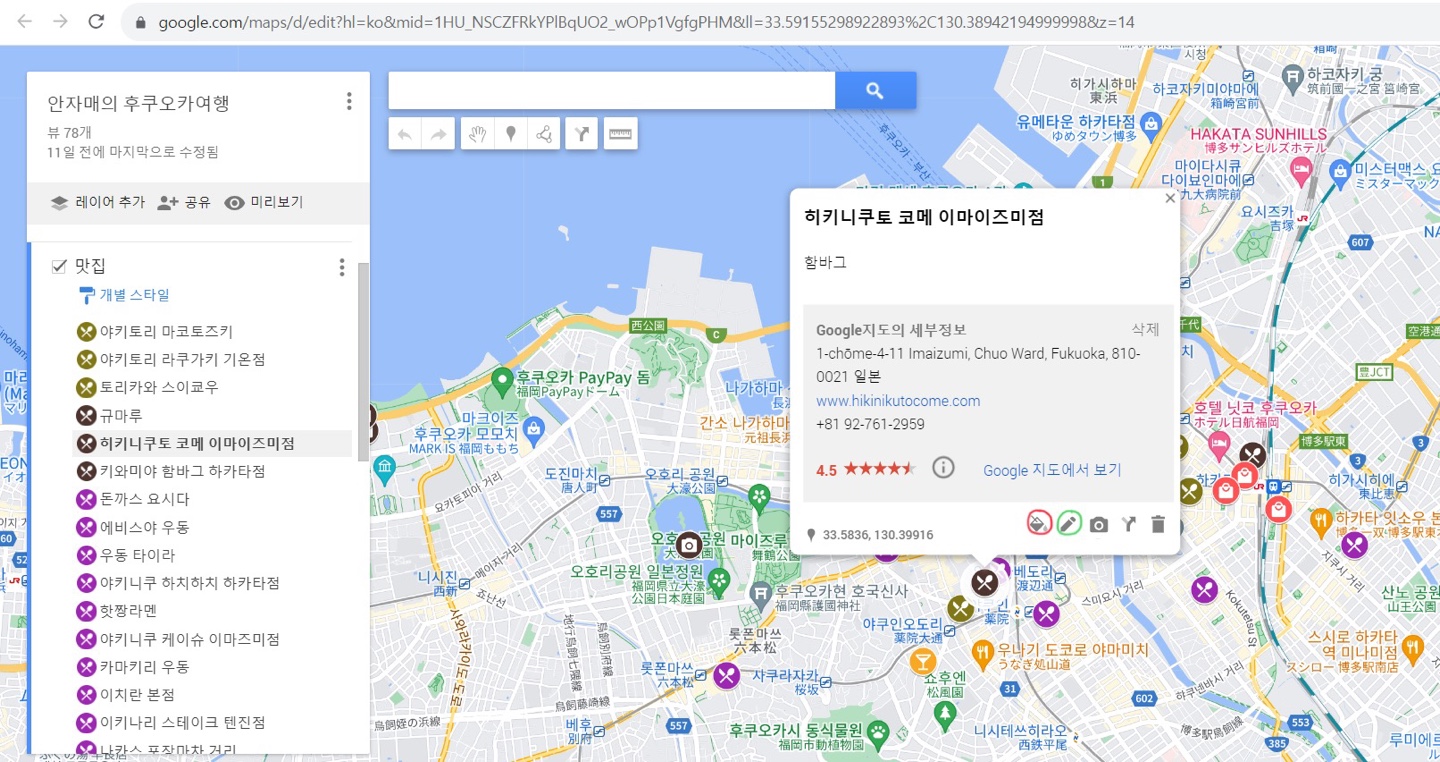 이 외에도 편집 화면에서는 일자별로 여행 경로를 설정하여 레이어를 추가할 수도 있습니다. 여행을 가기 전에 계획을 세우면서 활용하는 것도 추천드립니다. 저의 경우에는 경로 설정은 하지 않고 가고자 하는 장소만 추가하여 레이어별로 정리해 놓고 구글맵스 어플을 활용하여 경로를 찾아갑니다. 이 글을 읽으시는 분들도 지도를 만들어서 여행에 활용해 보는 것을 추천드립니다.